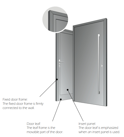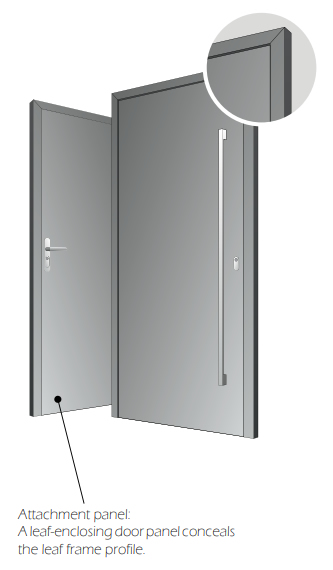 The decorative door panel overlaps the leaf profile when looked from the outside, minimizing the visible frame line. Aluminum sandwich panel insert, with 47 mm (1.85”) thick EPS filling, provides high thermal insulation