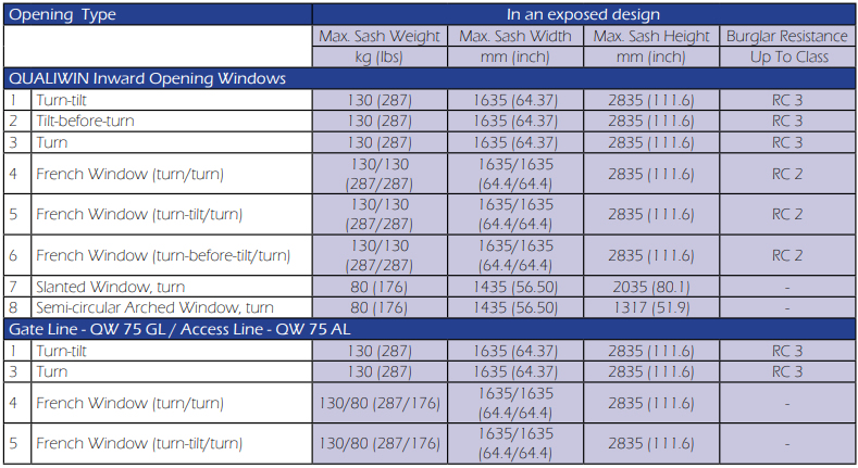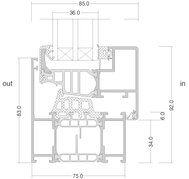 - Total visible frame line of sash and frame is 83 mm (3.27”) for the outside and 92 mm (3.62”) for the inside.